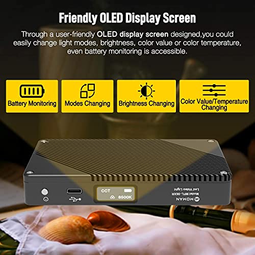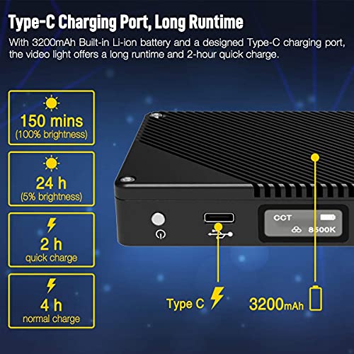 【Lange Ablaufzeit & OLED-Bildschirm】Mit einem eingebauten Li-Ionen-Akku mit 3200 mAh bietet das Videolicht eine lange Ablaufzeit: 100% Helligkeit für 150 Minuten, 5% Helligkeit für 24 Stunden. Ein benutzerfreundlicher OLED-Bildschirm befindet sich oben auf der Videoleuchte. Über diesen Mini-Bildschirm können Sie leicht den Lichtmodus oder die Helligkeit abändern, sogar die Batterieüberwachung ist zugänglich.