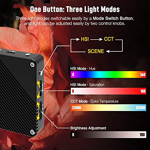 【Ein Knopf, drei Lichtmodi】Drei Lichtmodi: CCT-Modus, HSI-Modus, Szenenmodus, die über eine Modusumschalttaste umgeschaltet werden können. Im CCT-Modus kann die Farbtemperatur von 2500 K bis 8500 K eingestellt werden. Im HSI-Modus können Sie sowohl den Farbwert (0-360°) als auch die Farbtemperatur (0-100) ändern.