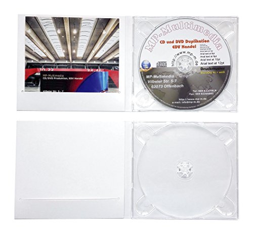 CD Hüllen weiß neutral mit Dispolack glänzend (Klarlack) beschichtet, zum Bedrucken mit Aufklebern oder Stempel, ca 140 x 125 x 6 mm. Zusätzlich innen links mit einem Einsteckschlitz (Booklet-Schlitz) zum Einstecken von Papier Einlegern bis 120 x 121 und bis eine Stärke von etwa 1,5 mm, z. B. Booklet, Cover, Einladung, Visitenkarte usw. Hervorragend entsprechend für CD Aufbewahrung qua alias wie Geschenkverpackung, Hochzeit Einladung, selbst individualisierte Verpackung zum Verschenken von besonderen CD, DVD oder Blu-Rays usw.