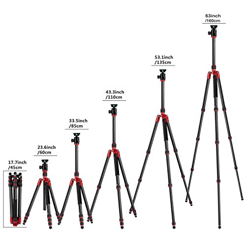 Verlängert bis 67 „/ 170cm groß, Falten 17.7“ /45cm.Vier Abschnitte Kohlenfaser höhenverstellbare Beinrohre.