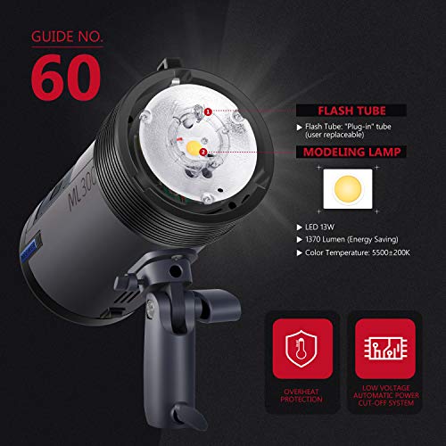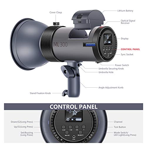 Professionelle Stromversorgung: Der Neewer ML300 verwendet einen Akku einer internationalen Marke, der eine Powerbox mit großer Kapazität (10,8V/7800 mAh) unterstützt, 1000 Blitze mit voller Leistung liefert und in 0,4 bis 2,5 Sekunden recycelt. Perfekter Schutzmechanismus mit Überhitzungsschutz, Niederspannungs Abschaltschutz