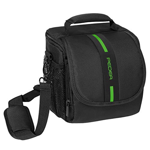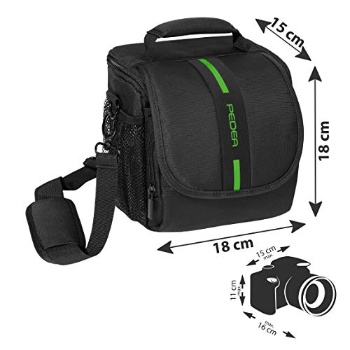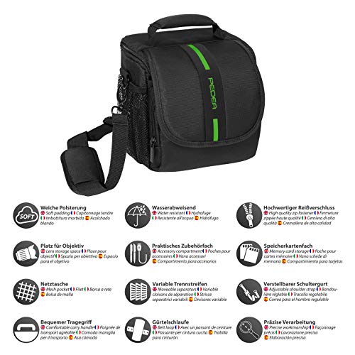 Die modische PEDEA Kameratasche überzeugt in Form, Design und Funktionalität. Die Tasche verfügt über insgesamt vier Fächer, zwei in der Innen- und zwei auf der Außenseite der Tasche. Die Außenfächer bestehen aus einem Netz, in denen Sie Ihr Zubehör verstauen können. In der Innenseite finden Sie Platz für DSLR und Spiegelreflexkameras mit kleineren bis mittleren Objektiven. Das besondere hierbei ist, dass Sie durch den variablen Trennstreifen in der Tasche auch Ihre Kamera abgetrennt von den Objektiven mitführen können, ohne dass diese lose in der Tasche herumliegen. Auch für Ihre Speicherkarten wird gesorgt. Zwei kleine Fächer an der Innenseite des Deckels bieten einen sicheren Platz für die empfindlichen Chips. Unter der Klettverschlusslasche auf der Vorderseite befindet sich das zweite Fach. In dem kleinen Fach befindet sich genug Stauraum für Akkus und anderes Zubehör. Auch hier wird nochmals maximaler Abschirmung durch die für die Akkus bestimmten Täschchen geboten. Alle Taschen besitzen eine weiche Polsterung und bieten somit optimalen Abschirmung vor Kratzern und Stößen. Die PEDEA Kameratsche besitzt einen Tragegriff, Schultergurt und eine Gürtelaufnahme. So können Sie je nach belieben Ihre Tasche verstreben.