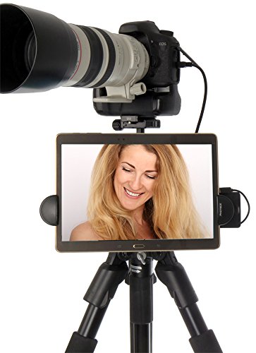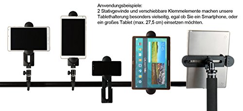 Tablets und Smartphones können im Quer- oder Hochformat erschütterungsfest eingespannt werden, und dies in Sekunden. Dabei lässt sich die schmale Halterung immer so platzieren, dass ggf. benötigte Anschlüsse zugänglich bleiben. Gleich 2 Stativgewinde und der integrierte Stativkopf ermöglicht die ideale Einstellung des Blickwinkels. Optimierte Abwandlung, d.h. das hintere, verschiebbare Anschlussgewinde ist erheblich stabiler und hat kaum noch Spiel.