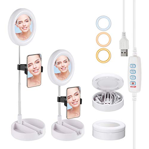 Powerextra Selfie Ringleuchte mit Handyhalter und Spiegel, 3 Lichtmodi mit Fernbedienung, 6.5Zoll Makeup Dimmbare Licht…