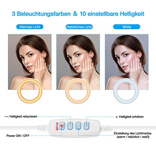 【Einstellbare Helligkeit】 Mit 3 Beleuchtungsfarben und 10 einstellbaren Helligkeiten kann dieses Ringlicht jeder Ihre Anforderungen in verschiedenen Situationen verschließen. Es ist die perfekte dimmbare Beleuchtung, um jeder Schatten zu separieren und Ihre Schönheit hervorzuheben.