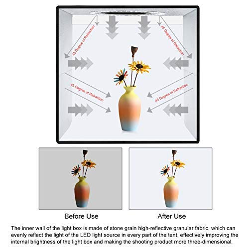 【Faltbares Design】 Die Lichtbox hat ein faltbares Design, die Installation und Zerrüttung kann ohne Werkzeug durchgeführt werden, was die Tragbarkeit erheblich verbessert. Das Schießzelt verfügt über eine USB-Schnittstelle und kann an viele Geräte angeschlossen werden, es kann verwendet werden, um die Bedürfnisse der meisten Menschen zu absolvieren.