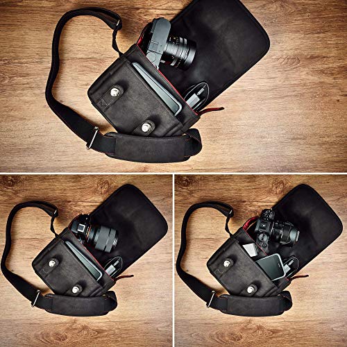 MAßE & FARBE – Rote Kontrastnähte machen die schwarze Kameratasche zu einem echten Hingucker. Innere Abmessungen: 20 x 14,5 x 9,4 cm, äußere Abmessungen: 21 x 16,5 x 11,5 cm (BxHxT). Gewicht: 516g.