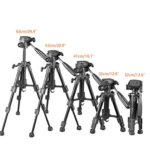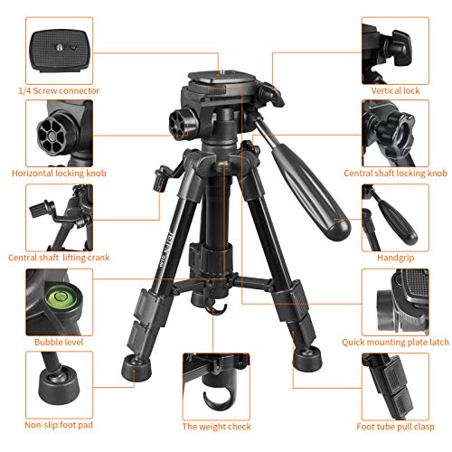 Eine präzise Wasserwaage. Das Design beinhaltet drei Einstellknöpfe zum Neutralisieren des Schwenkkopf-Effekts, wenn anwendbar, mit Fähigkeiten, in jedem Winkel mit Präzision und Effizienz zu abfeuern. Voller Funktionen: 3-Wege-Schwenkkopf/Neigekopf, Schnellwechsel-Montageplatte, Wasserwaage, Schnellschnapp-Beinverriegelungen, ausziehbare Mittelsäule, rutschfeste Gummifüße.