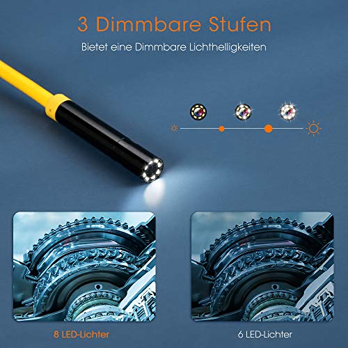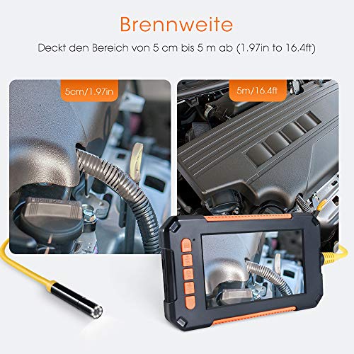 8 mm Endoskop, 5 m Kabel: Die Kamera verfügt über ein kleines Premium-Endoskop mit 8 mm Durchmesser und ein leicht zu biegendes halbstarres Kabel (16,4 Fuß/5 m), mit dem Sie mühelos auf enge, tiefe, staubige oder schwer zugängliche Bereiche erreichen können