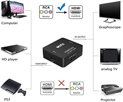【Breites Einsatzspektrum】Der 1080P AV zu HDMI Adapter wandelt ein digitales HDMI-Signal in ein analoges Composite-Videosignal um. Dies ermöglicht den Anschluss von Geräten mit HDMI-Ausgang wie Festplattenrekordern, Blu-ray-Playern, Spielekonsolen, Fernsehempfängern oder Computern an ältere AV-Geräte wie Beamer, Grabber, Röhrenfernseher, Volkshochschule, Videorecorder oder DVD-Player.