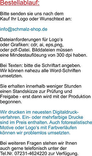Druckerzeugnis: 5c-Digitaldruck (Weißdruck ist etwaig) Bitte senden Sie uns nach dem Aufkauf Ihre Logodatei Wie eps, cdr, ai, pdf oder Bilddatei Wie jpg mit mind. 300dpi Förderung unter Allüren der Bestellnummer, an info@schmalz-werbeservice.de . Sie erhalten vor dem Druckerzeugnis einen Korrekturabzug zur Freigabe.
