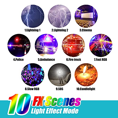 【RGB-Farbe】 RGB 0–360 Vollfarbe mit 16 Millionen Kombinationen von Farbsättigung, 2500 K-8500 K Farbtemperaturregelung, dimmbare Helligkeit von 1 % bis 100 % m, 4 funktionelle Modi und 10 gemeinsame Lichtszenen, Donner-Blitz 2, Kino, Polizei, Krankenwagen, Feuerwehrwagen, schnelles RGB. RBG, SOS. Kerzenlicht.