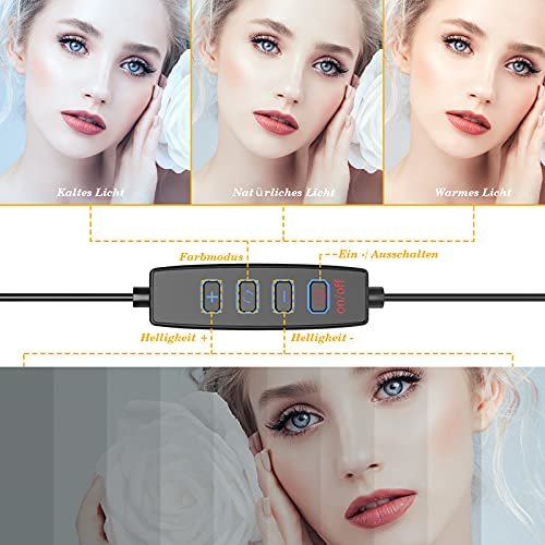 Dimmbares Ringlicht Mit Stativ: sorge für das richtige Funkeln in deinen Augen. Dank die 24W 2300 Lumen LED Ringleuchte, 3 Lichtfarben (kaltweiß, naturweiß, warmweiß) und 10 dimmbaren Helligkeitsstufen ist für Make-up, YouTube-Videos, Live-Übertragungen, Selfie-Fotos, Online-Unterricht, Tiktok usw. vorgesehen! Erfüllen Sie die Bedürfnisse verschiedener Charaktere in verschiedenen Szenen und bringen Sie verschiedene fotogene Effekte.