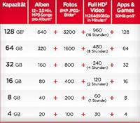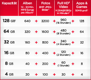 Die Auswahl der richtigen Kapazität hängt in großem Maße davon ab, welche Dateien man darauf bereithalten möchte. Full HD2-Videos brauchen beispielsweise massenhaft mehr Speicherplatz als einfache Schnappschüsse. Die Größe von Musikdateien variiert je nach dem Format, in dem sie gespeichert sind. Die folgende Diagramm soll Ihnen dabei helfen, die richtige Wahlgang zu treffen. Bei Zugrundelegung typischer Dateigrößen wird angegeben, welche Inhalte sie jeweils bereithalten können.