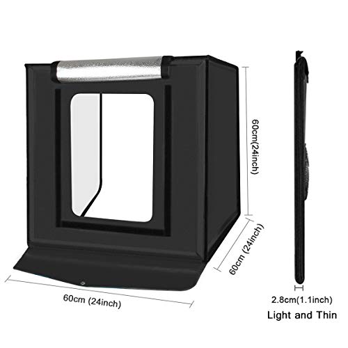 Verbesserte 60-cm-Variante: Ausgestattet mit dimmbaren 2x 60LED-Lichtern ohne Blitz, die eine ausreichende Beleuchtung garantieren. Es ist so einfach, qualitativ hochwertige Bilder zu erhalten, da die LEDs ohne Blitzlicht leuchten, selbst wenn Sie zum Ablichten ein Mobiltelefon verwenden. Kommen Sie auch mit einem Telefonstativ, um bessere Bilder zu erhalten.