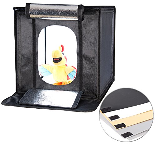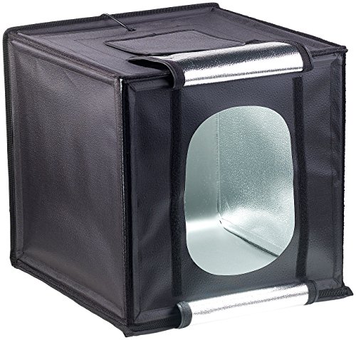 Stabile Box mit praktischen Klettband-Kanten: schnell und einfach einsatzbereit • Front- und Ober-Fenster für verschiedene Fotografie-Perspektiven • 4 umlaufende COB-LED-Lichtleisten, Leistung gesamt: 40 Watt, Helligkeit gesamt: 2.400 Lumen • Trage-Gurt für einfachen Transport • Maße: 40 x 40 x 40 cm, gefaltet: 24 x 24 x 3,5 cm, Gewicht: 600 g