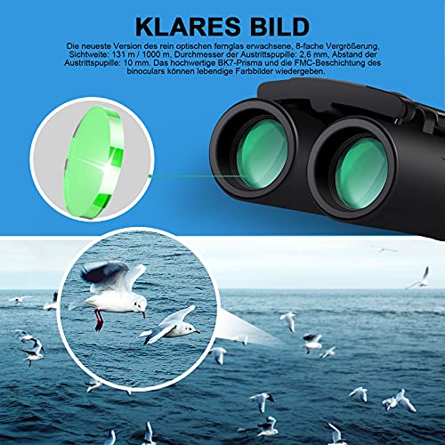 [Klares Bild] Die neueste Version des rein optischen fernglas erwachsene, 8-fache Vergrößerung, Sichtweite: 131 m / 1000 m, Durchmesser der Austrittspupille: 2,6 mm, Abstand der Austrittspupille: 10 mm. Das hochwertige BK7-Prisma und die FMC-Beschichtung des binoculars können lebendige Farbbilder wiedergeben. Selbst bei schlechten Lichtverhältnissen hochauflösende Bilder mit minimaler Verzerrung und chromatischer Aberration.
