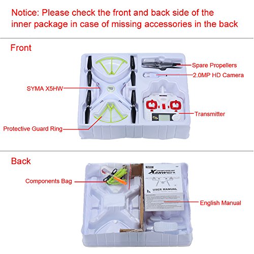 Spezifikationen: Produkt: rc quadcopter Material: Antiblockiersystem Farbe: blau / weiß optional Fernbedienung: 4 Kanäle / Modus 2 Gyroscope: Sechs Spiegelachse Motor: Coreless Motor Kamera: 0.3MP HD-Kamera FPV-Übertragung: Wi-Fi in Echtzeit Tabelle: 360 ° Umstülpen, CF-Modus, nach oben, herunter, links, rechts, vorwärts, rückwärts, schweben Fernabstand: ungefähr 30-50m Akku für quadcopter: 3.7V 500mAh Li-Po Ladezeit: ca. 130 Minuten Arbeitszeit: 5-7 Minuten Batterie der Fernbedienung: 4 * AA Batterie (nicht im Lieferumfang enthalten) Quadcopter Batterie Abmessungen: 43 * 25 * 8mm Maße: 330 * 330 * 110mm Artikelgewicht: 119g Paketinformationen: Packungsgröße: 44,5 * 24,5 * 11cm / 17,5 * 9.7 * 4.3in Paketgewicht: 744g / 1.6lb Geschenk-Box-Paket Verbannen: Die Drohne sind das gleiche Produkt gerade unterschiedliche Verpackungen. Diese RC-Drohne ist mit kernlosen DC-Motoren ausgestattet, kontinuierliche Verwendung mit verschiedenen Batterien wird nicht vorgeschlagen. Das RC-Modell ist kein Spielzeug und ist für Kinder unter 14 Jahren nicht geeignet, halten Sie es von Kindern fern. Lesen Sie kritisch die Anweisung vor jedem Gebrauch, wenn Sie ein Anfänger sind, ist es ratsam, von einem erfahrenen Erwachsenen unterstützt werden. Paketliste: 1 * RC Quadrocopter 1 * Fernsteuerung (Modus 2) 1 * 3.7V 500mAh Li-PO Batterie 1 * 0.3MP HD Kamera 2 * Paar Ersatzpropeller 4 * Schutzwache Ring 4 * Fahrwerk 1 * USB-Ladekabel 1 * Telefon Halteclip 1 * Schraubenzieher 1 * englisches Handbuch