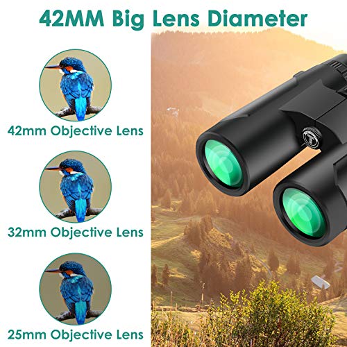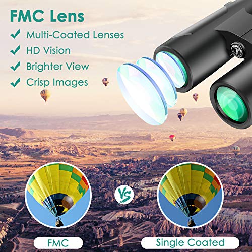 Hohe Kontraste und Auflösungsbilder: Neueste Optik-Technologie, das Fernglas ist mit BAK-4-Prisma und besoffen HD mehrfach beschichtetem Objektiv ausgestattet, garantiert überlegene Lichtdurchlässigkeit und Farbtreue, die Lichtdurchlässigkeit erreicht bis zu 99,5 % für bessere Bildhelligkeit, Kontrast und Qualität.
