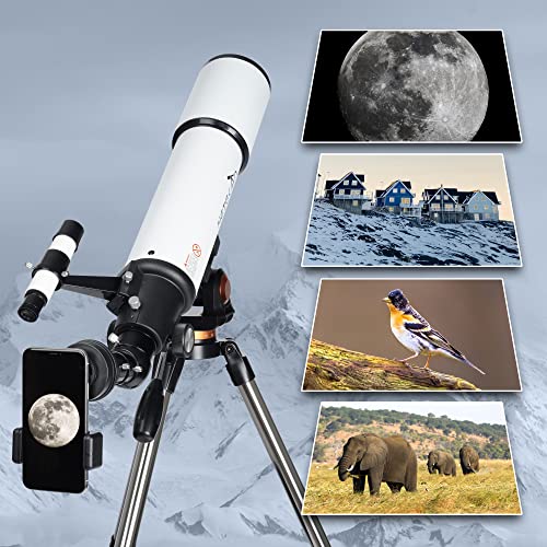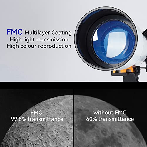 [Stabiles Stativ aus Edelstahl]: Unser Refraktor-Teleskop kommt mit einer Edelstahlhalterung stattdessen mehr Haltbarkeit und minus Wackeln bei der Studie von Landschaften oder Himmelsobjekten, es ist höhenverstellbar (25,7″-43,7″) und kann auf verschiedene Betrachtungspositionen aufeinander abgestimmt werden. Unser tragbares Teleskop wird mit einer Tragetasche geliefert, sodass es auf Reisen leicht zu transportieren ist.