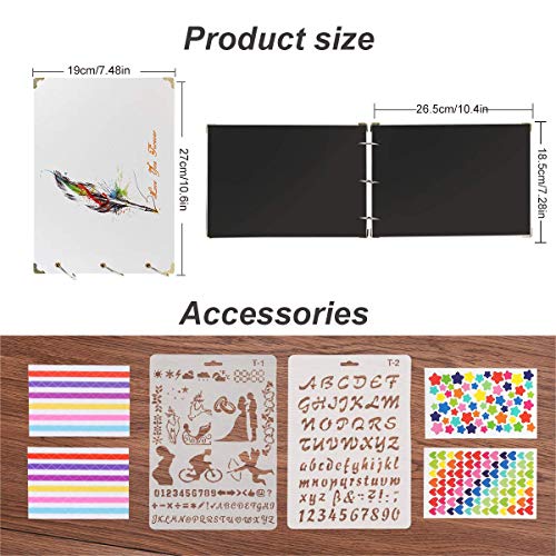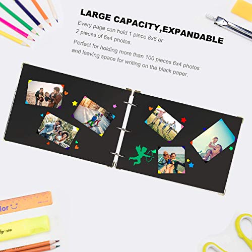 GRÖSSE UND KAPAZITÄT: Scrapbook Größe 27x19CM. Es hat 30 schwarze Blätter Papier/60 Seiten. Die schwarze Seiten Größe 26,5×18,5CM(zwischen A5 und A4), Perfekt für mehr als 100 Abschnitt 6×4 oder 7×5 Steuer Fotos halten und Sphäre verwaist auf dem schwarzen Papier zum Notieren.
