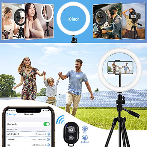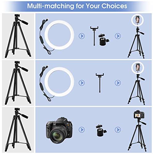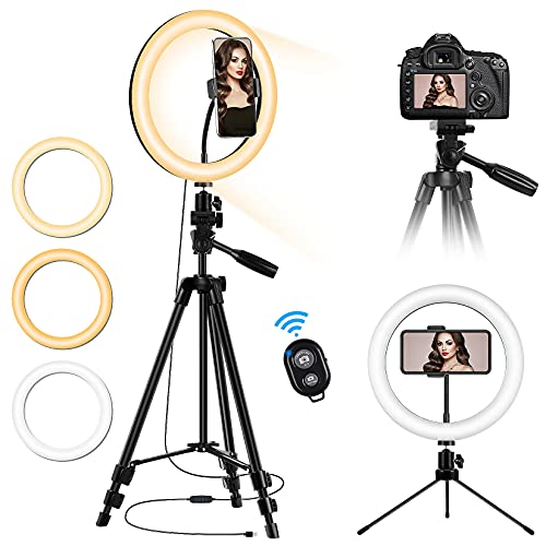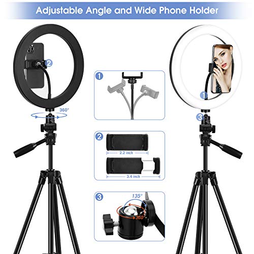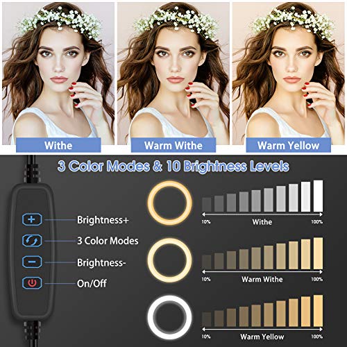 【10 Aufschlag LED-Ringlicht】 – 10 Aufschlag Lichtkreis, mit 120pcs energiesparende Lampenperlen und Bogenlampenschirm-Design, vermeidet Flackern, Blendung und macht Licht konzentrierter und sanfter. 3 Farb-Beleuchtungsmodi: Kaltweiß, Warmweiß und Warmgelb. Jeder Modus hat 10 verschiedene Helligkeitsänderungen von 1% bis 100%. Farbtemperatur ändert sich von 2800 K bis 5600 K, keine Farbfilter erforderlich.