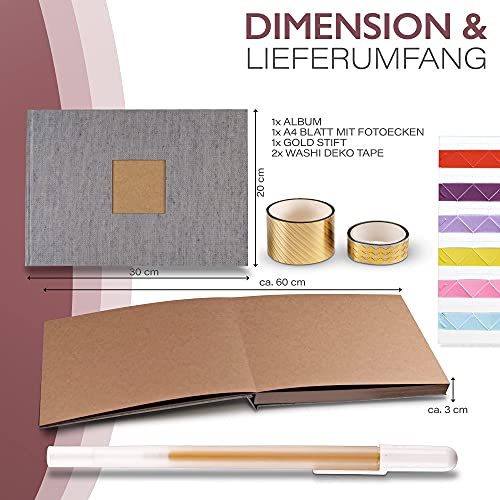 📒 UMFANGREICHES ZUBEHÖR – Unser Fotobuch zum selbstgestalten bietet dir einzigartige Gestaltungsmöglichkeiten. Zusammen mit zwei Rollen japanischem Washi Tape, einem goldenen Stift und Fotoecken zum einkleben, kannst du dein Scrapbook Album Aufziehen!