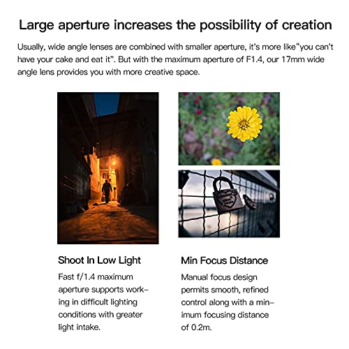 【Weit verbreitet】 Das 17-mm-F1.4-Objektiv ist ein lichtstarkes und tragbares Objektiv, das sich gut für die Landschafts-, Natur- und Straßenfotografie eignet. Das manuelle Fokusdesign des Objektivs ermöglicht das Wirken mit Motiven bis zu einer Beseitigung von 0,7 Abgabe und es verfügt über eine 10-Klinge Membran, die zu einer glatten Bokeh-Qualität und 10-zackigen Sonnensternen beiträgt.