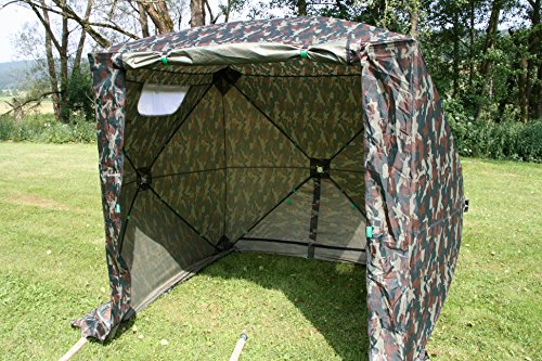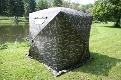 Uhatex Cube S Faltzelt ohne Boden in der Farbe camouflage Angelzelt, Karpfenzeltt, Fotozelt, Outdoorzelt, Regenschutz im Freizeitbereich -Aufbauzeit statt dessen eine Person ca. 30 Sekunden -Vollziehung große Eintrittsöffnung mit 2 Reißverschlüßen und Klettbefestigung Fensteröffnungen mit Reißverschluß und Fliegengitter -Verfügbare Farbe weiß/gelb, camouflage -Zubehör: Tragetasche, Beutel mit 3 Heringen und Schnüren -nicht flammhemmend ausgerüstet -Wasserdruckbeständigkeit ca. 1000mmWS (gemäß DIN EN 20811) -Wahlmöglichkeit Details und Aufbauanleitung auf unserer Homepage www.uhatex.de Maße: Boden und Dach ca. 1,80×1,80×1,80m Maße: Mitte/Mitte ca. 1,90×1,85×1,90m