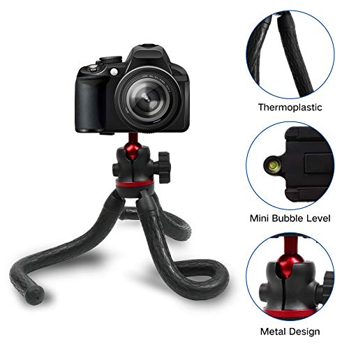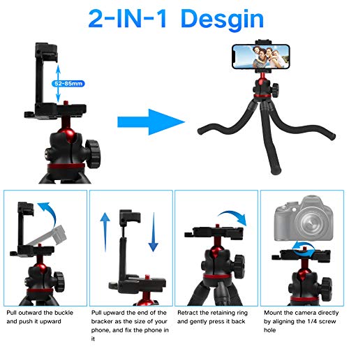【2 in 1 Kamerastativ】Unser Octopus-Stativ kann als Kamera- und Handyständer verwendet werden, teleskopbereich des Handyhalterung ist 52-85mm, geeignet für die meisten Smartphones. Die Länge der Tintenfischhalterung kann frei eingestellt werden, und die vertikale Höhe, die stehen kann, beträgt 27,5 cm.