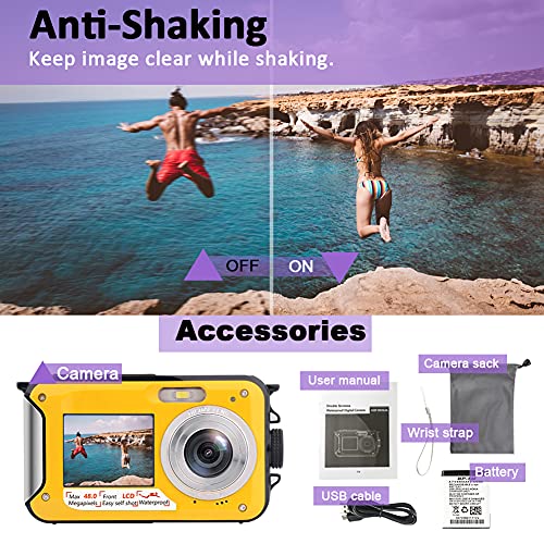 ▶【3 Meter wasserdicht, stoßfest】Diese digitale Unterwasserkamera ist aus wasserdichten Gründen vollständig versiegelt. Sie können jeweils eine Stunde lang bis zu 3 Meter tauchen, ohne ein zusätzliches Gehäuse zum Schutz zu verwenden. Die Handschlaufe sorgt dafür, dass Sie die kamera unterwasser beim Schnorcheln, Schwimmen oder Driften nicht verlieren. Die hochmoderne integrierte Anti-Shaking-Tabelle liefert gleichmäßige und gleichmäßige Bilder.