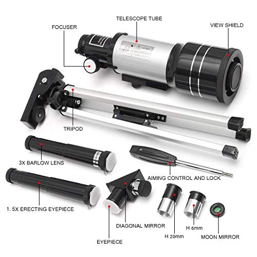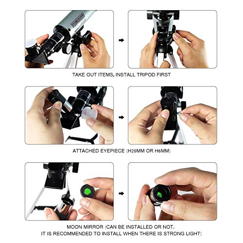 3.【Einfach zu Installieren & zu Verwenden】- Einfache Montage ohne Werkzeug erforderlich. Ausgestattet mit H20mm (um jeder Details der Krater auf dem Mond zu sehen), H6mm (um die terrestrischen Objekte auf dem Land zu sehen) und einem speziellen Mondspiegel kann das reflektierte Licht effektiv vermieden werden, und die Mondoberfläche wird dann klarer gesehen.