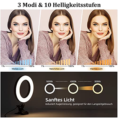 【Kompaktes Ringlicht mit Kratzfestem Montageclip】Das Kompakte 6-Aufschlag-Design mit Einer Kratzfesten Befestigungsklemme, Die mit Einem Dicken Silikonkissen (Maximale Mundöffnungsgröße: 3,5 cm) Ausgestattet ist, Ermöglicht die Montage Dieser Ringleuchte an Ihrem Laptop, Computer, Sogar Schreibtisch, Bett, Konferenztisch Die Metallklemme Hält Ihr LED Ringlicht im Gleichgewicht, Auch Wenn Sie es Einfach Auf Den Tisch Legen.