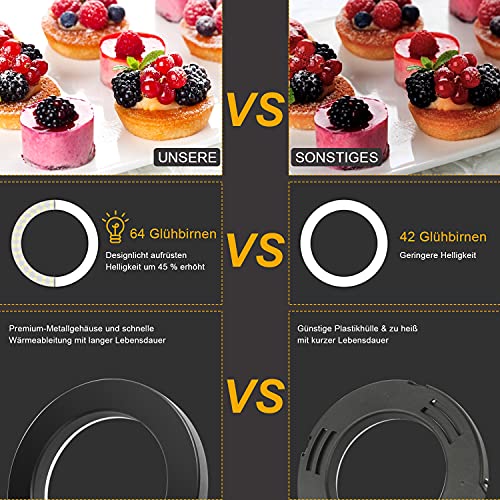 【3 Lichtfarben & 10 Helligkeiten】Die LED Lichtring Haben 3 Farbtemperaturen(Weißes Licht / Warmes Licht / Natürliches Licht)3000k-5000k,10 Helligkeitsstufen und 64 LED-Lampenperlen mit 10 W Helligkeit,LED Ringleuchte Kein Schatten und Das Weiche Licht ist Nicht Blendend.sodass Sie problemlos Videoaufnahmen durchführen oder Bilder an dunklen Orten aufnehmen können.