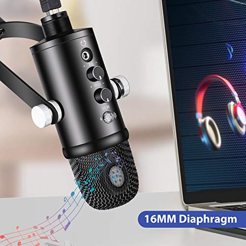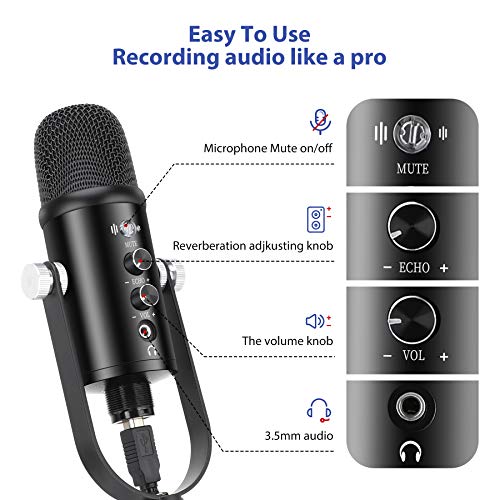 [Professionelles Soundchip Kit]: Das USB Kondensatormikrofon hat eine 16-mm-Membran, eine Breitbandantwort von 20 Hz bis 20 kHz, bietet eine Abtastfrequenz von bis zu 192 kHz / 24 Bit und verwendet ein professionelles Soundchip-Design, um das Kondensatormikrofon für klare und reibungslose Diagramm. Darüber hinaus verfügt das Studio-Kondensatormikrofon über Lautstärkeregler, Nachhall-Einstelltasten, Stummschalttasten und ein 3,5-MM-Audiointerface, das die Verwendung von Kopfhörern unterstützt.
