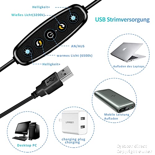 【USB-Stromversorgung】: Mehr Energieoptionen, da alle USB-Anschlüsse zur Stromversorgung von Clip-Videoleuchten verwendet werden können, z.B. Desktop-PCs, Laptops, mobile Stromversorgung oder Ladegeräte für Mobiltelefone. Die Lampe ist energiesparend und umweltfreundlichen. Hinweis: Das Aufladen wird dabei nicht unterstützt.