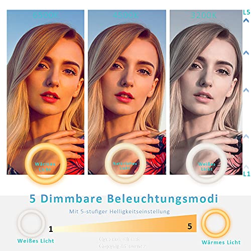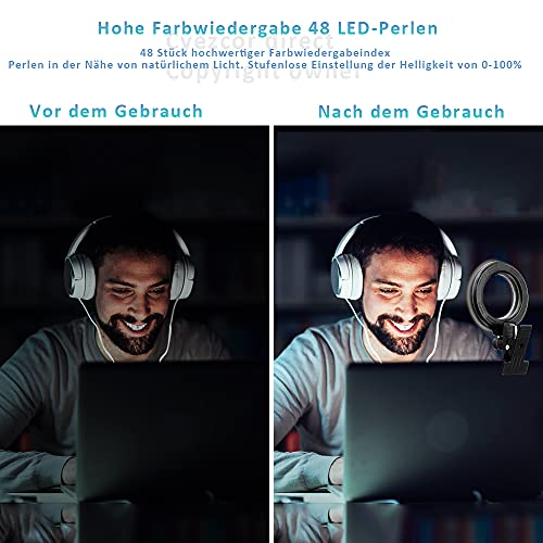 【Einstellbare Farbtemperatur und Helligkeit】: Unsere Videokonferenzleuchte hat 3 Farbtemperaturen (weißes Licht/ warmes Licht/natürliches Licht) 3200k-6800k, 5 Helligkeitsstufen und 48 LED-Lampenperlen mit 10 W Helligkeit. Sie können Ihre ideale Beleuchtung einfach über den Schalter adjustieren, um Ihre Haut perfekter zu ausarbeiten und sich Ihrer Umgebung anzupassen.
