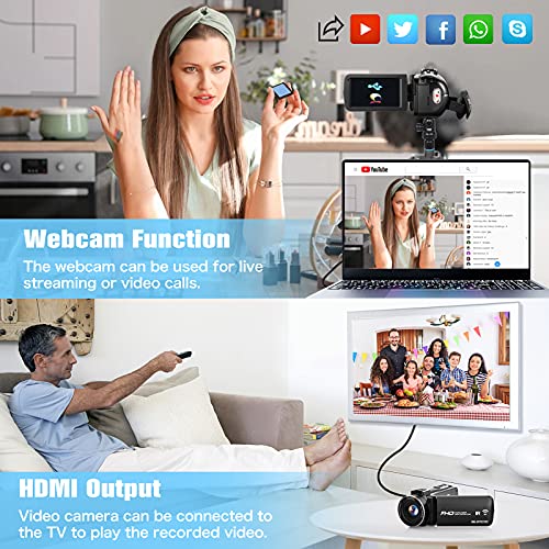【WLAN Verbindung und Fernbedienung】Der Wifi-Camcorder kann mit der Handy-APP verbunden werden und die „DV Cam“ App auf das Handy herunterladen, um die Echtzeit-Fernsteuerung der Kamera durch das Handy zu realisieren. Sie können eine Vorschau des Albums auf Ihrem Telefon anzeigen, die Kamera zum Aufnehmen von Bildern und Videoaufnahmen steuern und Bilder und Videos zur Speicherung auf Ihr Telefon herunterladen. Teilen Sie Ihr gutes Leben in sozialen Medien wie Facebook und YouTube.