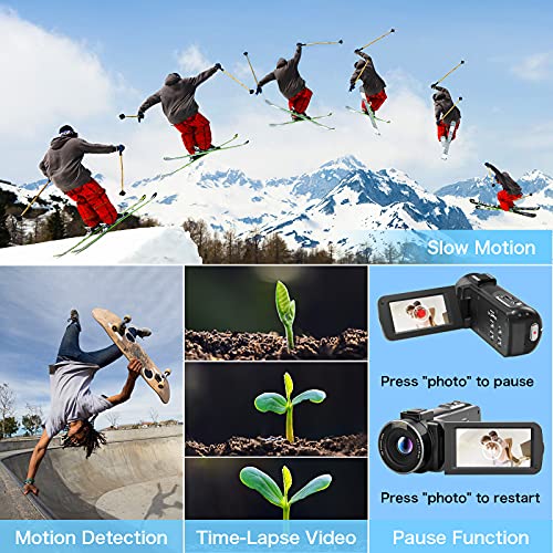 【Multifunktionskamera】Die Video Kamera kann Bewegungserkennung, Zeitlupenaufnahme, Zeitrafferaufnahme, Videopause usw. Bewegungserkennung kann die Kamera zum Einsaugen aufwecken, Zeitlupe kann Ihnen helfen, sich schnell bewegende Objekte aufzunehmen, Zeitrafferaufnahmen können den Akt bearbeiten und für die Spiegelbild komprimieren. Darüber hinaus bietet es Funktionen wie Gesichtserkennung, Lächeln, Gesichtsverschönerung und Selfies.