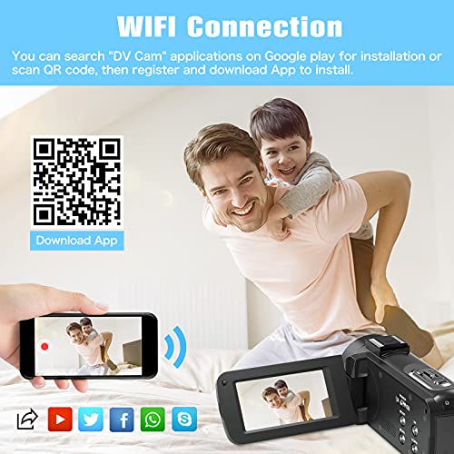 【WLAN Verbindung und Fernbedienung】Der Wifi-Camcorder kann mit der Handy-APP angewiesen werden und die „DV Cam“ App auf das Handy herunterladen, um die Echtzeit-Fernsteuerung der Kamera durch das Handy zu vorstellen. Sie können eine Vorschau des Albums auf Ihrem Telefon anzeigen, die Kamera zum Einsaugen von Bildern und Videoaufnahmen steuern und Bilder und Videos zur Speicherung auf Ihr Telefon herunterladen. Teilen Sie Ihr gutes Leben in sozialen Medien wie Facebook und YouTube.