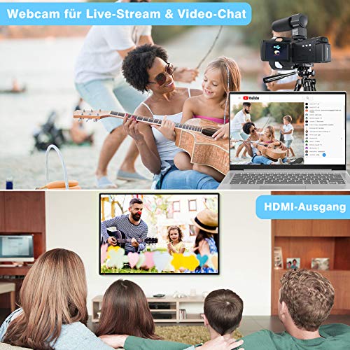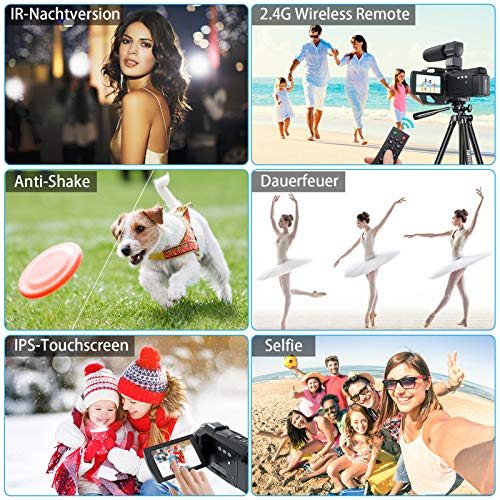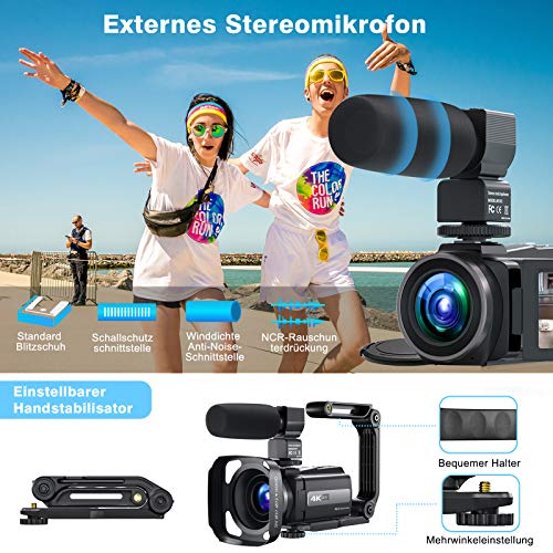 【Digitaler 4K Ultra HD-Videokamera】Camcorder verfügt über eine Videoauflösung von 4K / 30fps und eine Bildauflösung von 48 MP und unterstützt den 16-fachen Digitalzoom. Die Kamera verfügt über 3,0-Preis-Touchscreen mit 270-Maß-Rotationsfunktion und WIFI,IR-Nachtsicht, Webcam und Wifi-Ablichtung. TV-Druck, Pausenfunktion, Zeitlupe, Bewegungserkennung, Loop-Abdruck, Serienaufnahme, Gesichtsaufnahme, Schönheitsfunktion, Selbstauslöser, Wiedergabemodi, Verwacklungsschutz.