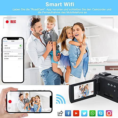 【Wi-Fi-Verbindung &Fernbedienung】4K Wifi Camcorder ermöglicht die Fernanzeige,Bilderfassung und Videoaufnahme.Laden Sie die „RoadCam“ APP direkt herunter, indem Sie den QR-Code im Benutzerhandbuch scannen oder bei Google Play suchen. Die „RoadCam“ APP verwandelt Ihr Tablet oder Smartphone in eine Echtzeitfernbedienung zur Steuerung des Camcorders (gültige Reichweite: 9,8 Fuß).Teile Fotos und Videos auf Facebook, YouTube und anderen sozialen Medien.