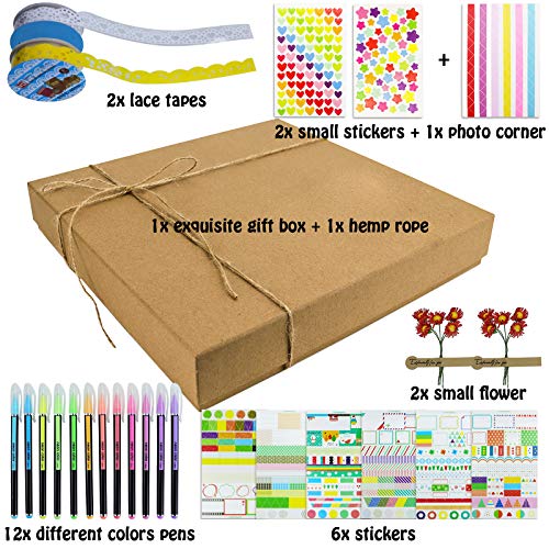 1. Sammelalbum-Set: 1 x Sammelalbum-Fotoalbum, 12 x Stifte in verschiedenen Farben, 2 x Spitzenbänder, 6 x DIY-Aufkleber, 1 x Fotoecke, 2 x kleine Aufkleber, 2 x kleine Blumen, 1 x Hanfseil und 1 x exquisite Geschenkbox