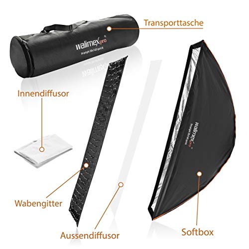 Lieferumfang – 1x Walimex pro Studio Line Striplight Softbox, 1x Grid, 1x Außendiffusor, 1x Innendiffusor, 1x Tragetasche, 1x Softbox-Passstück für Aurora-Bowens