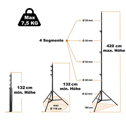 STABIL HOCH PRAKTISCH GÜNSTIG – robustes und besonders hohes Licht und Leuchtenstativ aus Aluminium, ideal für Video und Illustration mit Kamera LED Blitz Softbox Reflektor Galgen. Stativ Höhe über 4m, ideal für Aufnahmen von hoch oben.