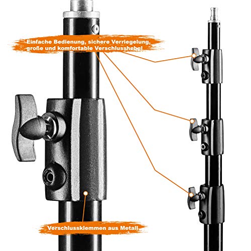 VIELSEITIGE ANWENDUNG – Einsetzbar für Fotostudio Bühne Outdoor zu Hause oder im Alltagsbereich. Beleuchtungsstativ erweiterbar mit Zubehör wie Sandsack Rollen Ausleger Adapter Halter Auslegearm Kugelkopf Traverse