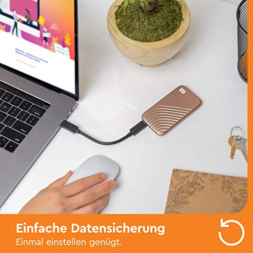 Lieferumfang: WD My Passport SSD 2 TB mobile Festplatte (NVMe-Technologie, USB-C und USB 3.2 Gen-2 kompatibel, Lesen 1050 MB/s, Verfassen 1000 MB/s) gold