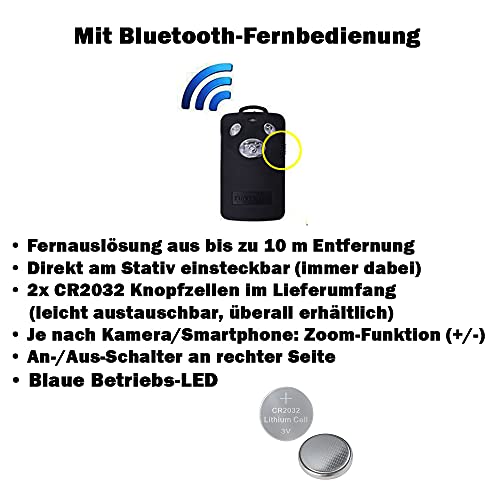 Inklusive Bluetooth-Fernbedienung / Fernauslöser, Handy/Smartphone-Halter mit kratzsicher gummierten Kontaktflächen (jede Handygröße einspannbar), 2x CR2032 Knopfzellen im Lieferumfang enthalten