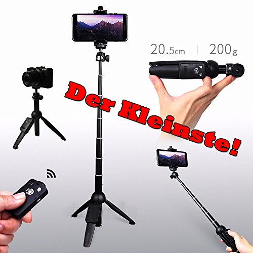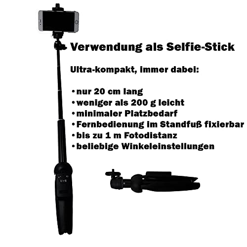 Eines der kompaktesten und leichtesten Stative auf dem Marktgebiet: 20 cm Länge, weniger als 200 Gramm Gewicht! Bis zu 1 m Fotografierhöhe ab Boden, stufenlos einstellbar, Tripod-System (3 Ausklapp-Füße)