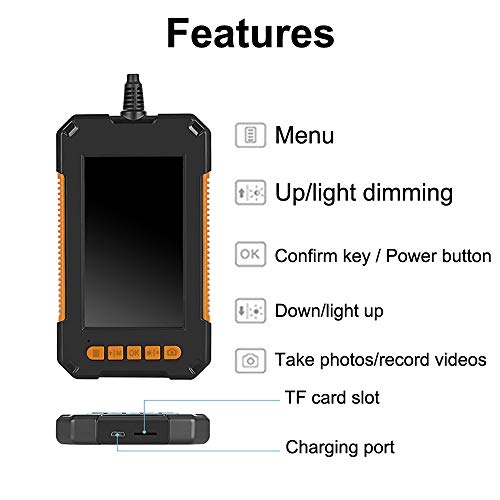 4,3-Steuer-Vollfarb-LCD-Bildschirm, wasserfeste Plug-and-Play-Kamera IP67, schlanke Sonde mit 8 mm Durchmesser, 8 einstellbare LED-Leuchten für den einfachen Einsatz in dunklen Umgebungen. Diese Endoskopkamera ist einfach zu bedienen und kann sofort nach dem Einschalten verwendet werden, um Testvideos in Echtzeit anzuzeigen. Zersplitterung bis zu 1080P für Bildaufnahme, Videoaufnahme.